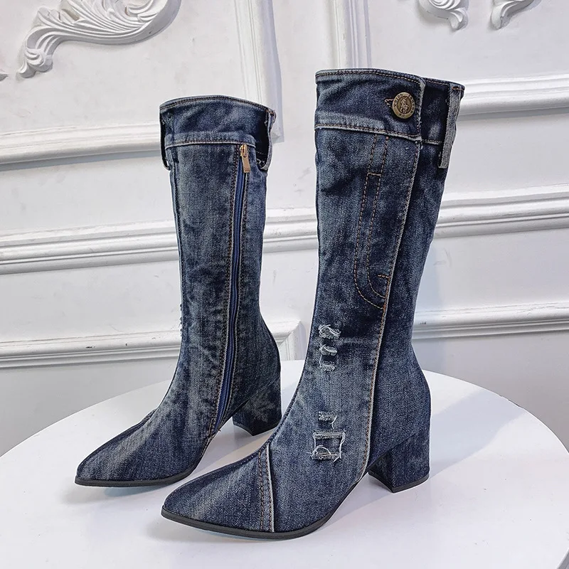 2022 Women Chunky Denim Mid-Calf Boots Block High Heels Boots Winter Fashion Cowboy Western Boots thick heels shoes