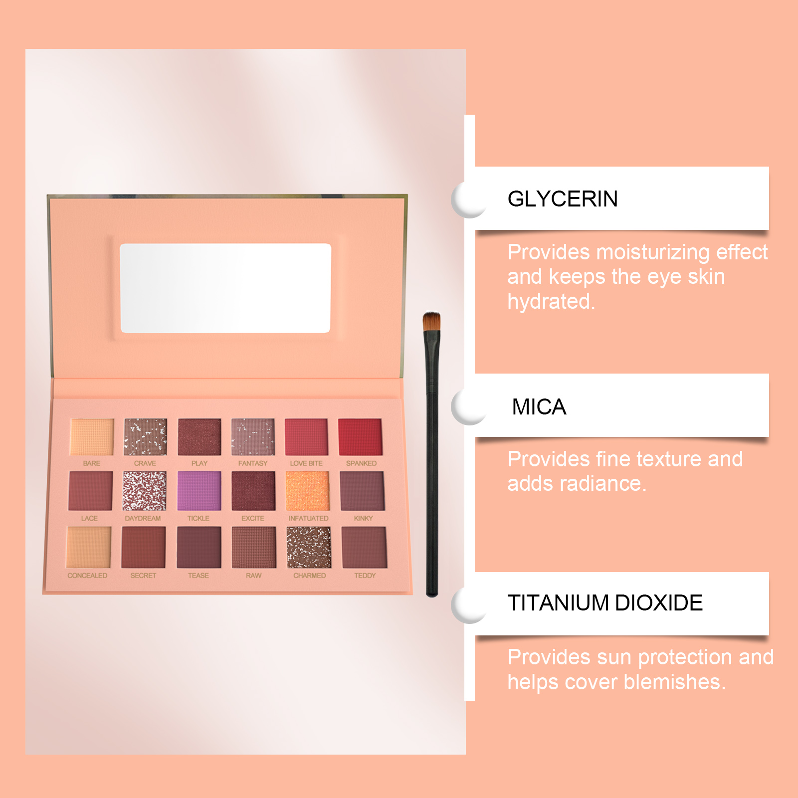 Our 18-color eyeshadow palette contains glycerin, mica, and titanium dioxide. It provides long-lasting moisture retention, keeping the eyes hydrated. The fine powder adheres to the skin without flaking. The application method is very simple: choose your favorite color, take an appropriate amount and apply it evenly on the skin around the eyes. There are various colors to meet different occasions' needs, and they can be easily matched to create personalized makeup. It is easy to color in, has a smooth texture, is easy to apply, has long-lasting makeup effect, and does not fade.
