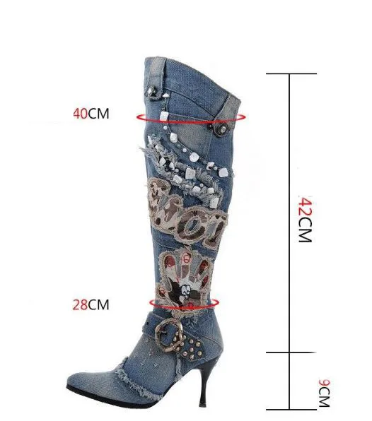 new fashionable denim boots qiu dong high-heeled shoes to wear bead high boots over-the-knee knight with female boots boots