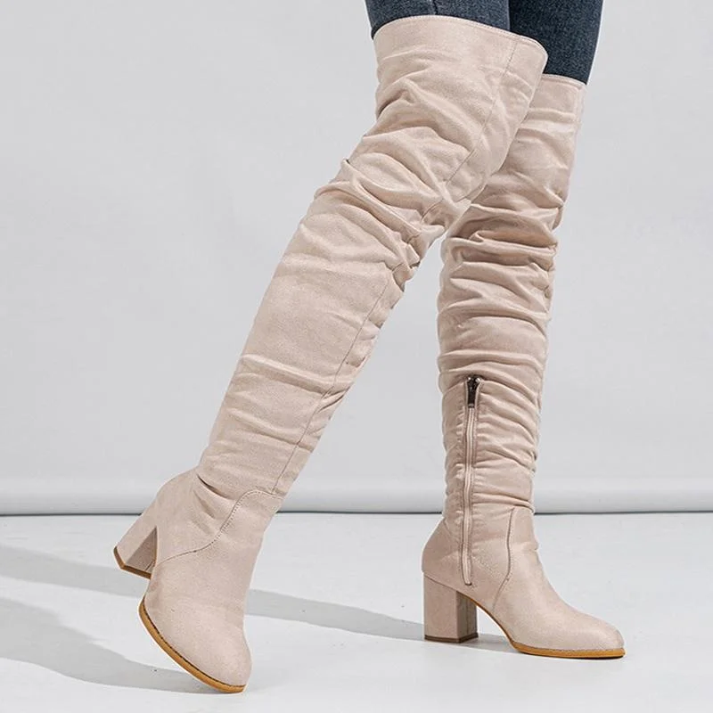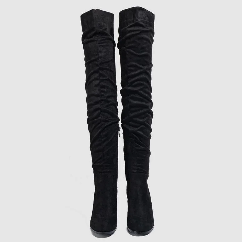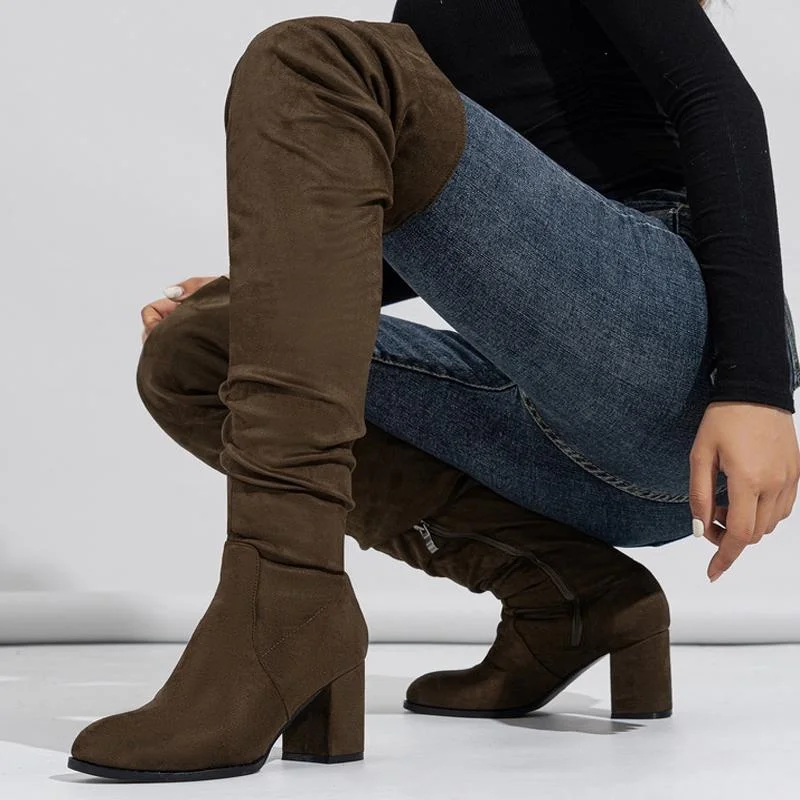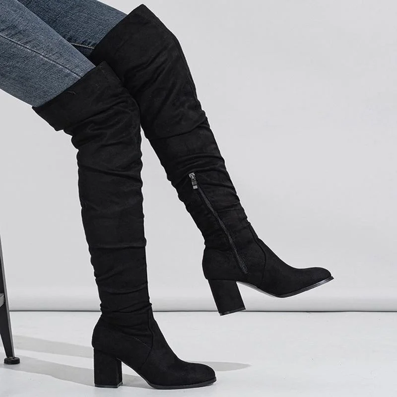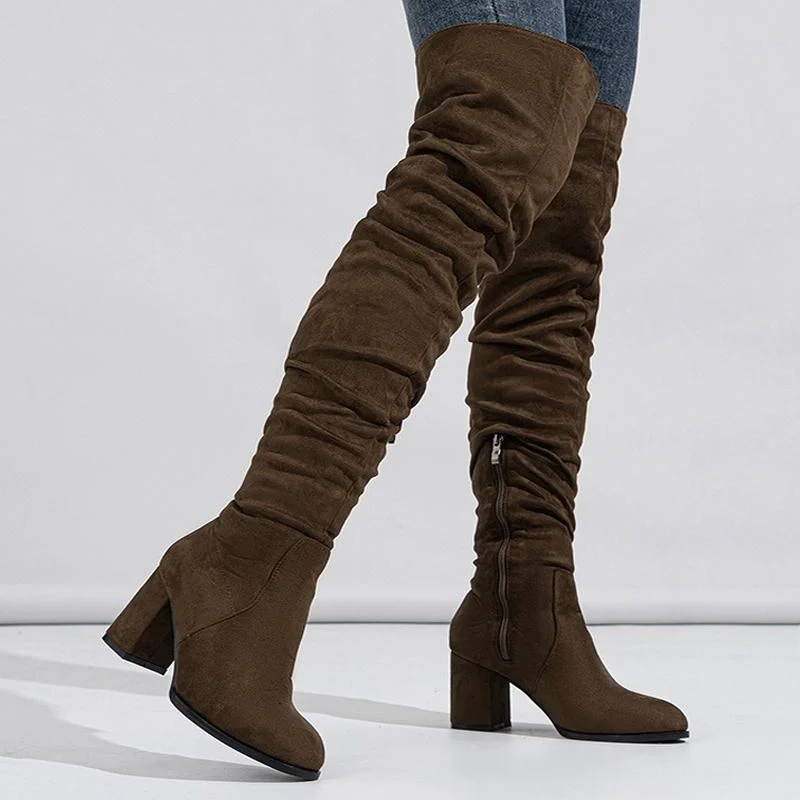 Women Flocks High Thick Heel Long Boots Lady Over The Knee Side Zipper Winter Boots Female Ruffle Office Fashion Boots