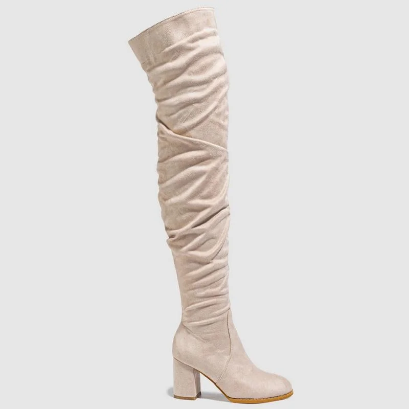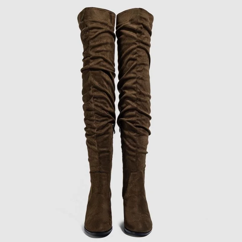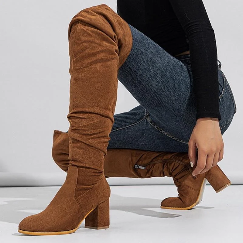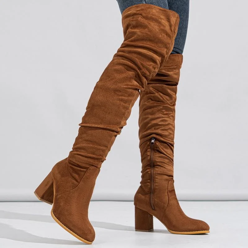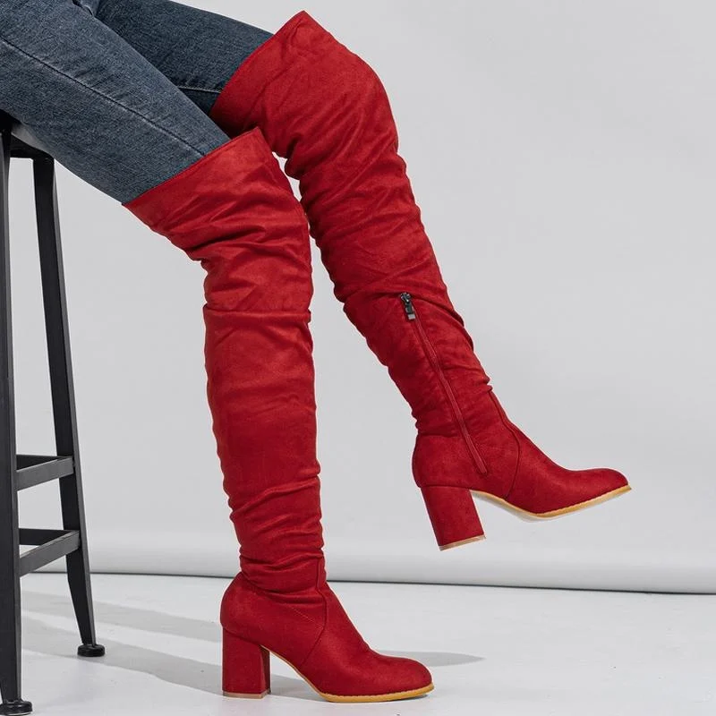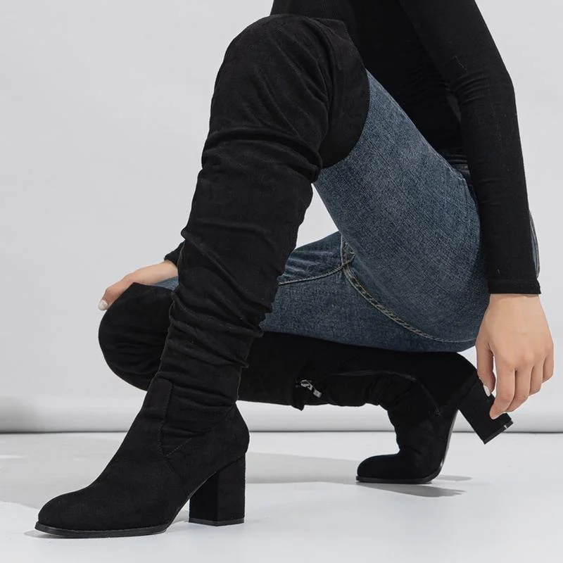 Women Flocks High Thick Heel Long Boots Lady Over The Knee Side Zipper Winter Boots Female Ruffle Office Fashion Boots